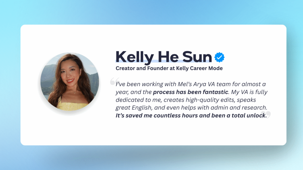 “I’ve been working with Mel’s Arya VA team for almost a year now, and the process has been fantastic. From testing work products before matching to the ongoing check-ins, everything has been smooth. My VA has been the best help , amazing video edits, wonderful English proficiency, and support beyond just editing. It’s been such an amazing unlock in saving me countless hours.”